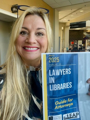 Special Thanks to All Lawyers in Libraries Volunteers The Louisiana State Bar Association’s 11th Annual Lawyers in Libraries Week and National Celebrate Pro Bono Week were made possible by the extraordinary dedication of volunteer attorneys and library partners across the state. Through in-person consultations, phone-based assistance, and educational webinars, attorneys helped bring meaningful legal guidance directly to Louisiana communities—especially those facing barriers to access. Thanks to the dedication of volunteers, 192 attorneys signed up to serve at 206 events in 64 library branch locations statewide, contributing more than 500 hours of pro bono service during the Lawyers in Libraries week.Special Thank You to all Attorneys who signed up to volunteer: Janeane G. Abbott Jenny A. Absheir Kaitlyn E. Adams Joshua D. Allison Sara T. Anderson Clarke Andretta B. Atkins Rita K. Bacot Erin C. Bagent Jessica A. Ballard Barry M. Barnett Cristin C. Barr Stephanie M. Beaugh Emily C. Belanger Alex J. Bellow Lisa A. Benefield Paul H. Benoist Natalie S. Blackman Loyd J. Bourgeois, Jr. Adrejia L. Boutte Elena P. Branzaru Melanie A. Bray Jonathan L. Brehm Donita Y. Brooks Amanda L. Brown Rubi L. Brown-Spears Samantha H. Brumfield Lakethia B. Bryant Misti L. Bryant Murphy J. Burke, III Shiena M. Burke Claire E. Caillier Christopher T. (Chris) Castro JaVonna R. Charles-Young Paula M. Charles Brittany B. Chavis Micah O. Clemons Daniel G. (Dan) Collarini Rebecca M. Collins Mariarenee Contreras Tyler C. Cooley Jacques J. Cousin Keith M. Couture Stephen D. Cox Mekisha S. Creal Adolph B. Curet, III Guy C. Curry Morgan S. Daniels Kenneth A. Doggett Amy E. Duncan Brock H. Duke Arlene C. Edwards Reed K. Ellis Janeane E. (Jane) Booth Adele P. Faust Huey L. Fischer Garcia Abigail L. Floresca James Casey Fos Cheryl M. Gaines Corrie R. Gallien Grant P. Gardiner Harrece C. Gassery Jill A. Giberga Rebecca Gilson John C. Ginart Lewis M. Gladney Deidra L. Godfrey Michael A. (Mike) Gorbaty Eugene (Gene) Gouaux, III Ryan M. Goudelock Wayne C. Grant Louis J. Gregory David F. Gremillion Julius W. Grubbs, Jr. Jordan P. Guillot Emily R. Hager Chareese D. Haile Pamela D. Hall Tanya M. Hamilton Billy J. Harrington Schalyece M. Harrison Taetrece Harrison Brent A. Hawkins Ranee L. Haynes Darryl J. Hebert Katie L. Hebert Chaucey J. Hessnor Eric (Micah) Hoggatt Aaron J. Hurd Julhelene E. Jackson Kaylin E. Jolivette Anna S. Jones Crystal G. Jones Benjamin D. Jones Ravinder P. Khinda Daniel A. Kramer Karly Kyzar Dorr Brittany D. LaCombe Holly Lamarche Soren T. Lannes Arthur G. Laugand Hon. John J. (Johnny) Lee, Jr. Kathleen M. Legendre Sarah A. Legendre Siobhan S. Leger Andrew G. Legrand Robert G. Levy Shannon C. Lindsey Christopher M. Ludeau Sheryl L. Lyons Kim A. Madere James G. Maguire Tabitha O. Mangano Hailey E. Manint Bobby R. Manning Amanda T. Marionneaux Kenneth J. (Ken) Martinez Annie R. Matthews Laura B. Matthews Bethlyn O. Mayers Jacob A. McCon Brandon J. Melerine Barbara B. Melton Paula E. Miles Raven M. Miller Rachael M. Mills Linda A. Mitchell Chadwick J. (Chad) Mollere Sharon L. Morris John L. Norris, IV Patrick W. Pendley Jeffrey W. Peters Lauren R. Pilie Ewell C. Potts, III Rossanna Rahim McIlwain Steven T. Ramos Barry S. Ranshi Jonathan T. Reynolds Taneisha W. Riggs La Koshia R. Roberts John Van Robichaux, Jr. Alecia R. Robillard Joshua M. Robin Jennifer O. Robinson Carmen M. Rodriguez Julie D. Rosezweig Sophia B. Ryan Joyce S. Sallah Eve S. Reardon Wyatt P. Savant Jovian V. Scafati Cynthia F. Schmidt Oliver J. (Jackson) Schrumpf Daniel H. Schwarzenbach Christopher J. Sellers, Jr. Meghan B. Senter Darrell R. Sims Perrin (Nelson) Smith, Jr. Robert H. Smith Sharita L. Spears Matthew V. Spizale Elizabeth A. (Liz) Spurgeon Edrius D. Stagg John M. Stefanski Ian Stern Thomas R. Strohe, III Albert E. Struck Paul A. Tabary, III Susan (Sue) Tart Alexis A. Taylor Parris A. Taylor Perry W. Terrebonne Sandra B. Terrell Hilary C. Thompson Madison Jared (Matt) Tillery A. Scott Tillery Lane R. Trippe Alexis L. Tukes Cherish D. van Mullem David E. Verlander, III Summer D. Vicknair Allison R. Vidrine Brittany N. Waggener Pascale B. Watson Samantha G. Weidner Laurel I. White Kathryn A. Wiley David J. Williams Jane B. Wills Scott T. Winstead Tracie J. Woods Zachary L. Wool Joyce D. Young Attorneys Ewell Potts III, Adele Faust, Van Robichaux, Mike Gorbaty in St. Bernard Parish Attorneys Paul Tabary, Joshua Robin, John Ginart, Van Robichaux in St. Bernard Parish Attorneys Matthew Tillery, Scott Tillery, Joyce Young, Van Robichaux, Brandon Melerine in St. Bernard Parish Attorneys Keith Couture, Jordan Guillot, Van Robichaux in St. Bernard Parish Attorney Cynthia Schmidt in New Orleans East Library Attorney Eve Sarco Reardon in New Orleans East Library Attorney Lane R. Trippe in New Orleans East Library Attorney Taetrece Harrison in New Orleans East Library Attorney Grant Gardiner in Orleans Parish Norman Mayer Library Attorney Jane Booth in Orleans Parish Norman Mayer Library Attorney Rubi Brown-Spears in Orleans Parish Norman Mayer Library Attorney Jane Wills in Orleans Parish Norman Mayer Library Attorneys Josh Smith, Zachary Wool, Ian Stern, Christopher Sellers, and Huey Fischer Garcia in Orleans Parish Algiers Library Attorney Elena Branzura in East Baton Rouge Parish Library Attorney Shannon C. Lindsey in St. Tammany Parish Library Attorney Parris Taylor in West Baton Rouge Library Attorney Barry Barnett and Bob Levy at the Rapides Parish Library, Main Branch Attorney Kenneth Doggett and Rapides Parish Library Employee, Tara DeMarco at the Westside Regional Library Attorney Rita Bacot in Bossier Parish Library Attorney Chareese Haile in St. Helena Parish Library Attorneys Deidra Godfrey (selfie), Pamela Hall (left seated), Julhelene "Betsy" Jackson (right seated), Christopher Ludeau (middle standing), and Chauncey "C.J." Hessnor (left standing) with Librarian Ms. Gigi Fontenot (right standing in the Evangeline Parish Mamo