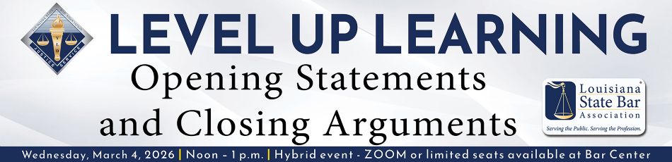Join the LSBA Young Lawyers Division for the first Level Up Learning program of 2026—a free CLE focused on crafting persuasive opening statements and delivering effective closing arguments. The session will feature Attorneys Jatavian L. Williams of Glago Williams and Gregory Carter of The G. Carter Law Firm, who will share practical insights and courtroom strategies. This CLE will take place Wednesday, March 4 from 12–1 p.m. Open to young lawyers only. One hour of CLE credit has been applied for. Limited In-Person space. Register Today!