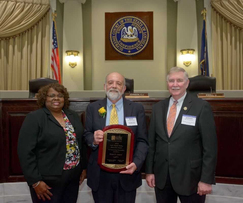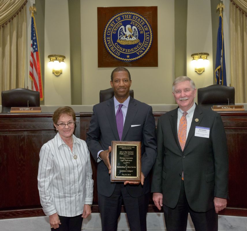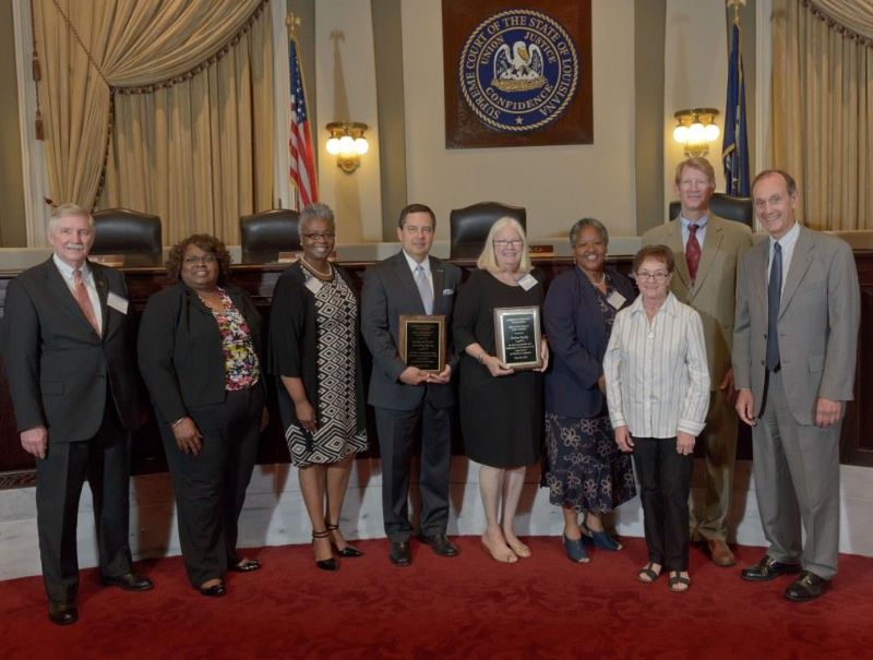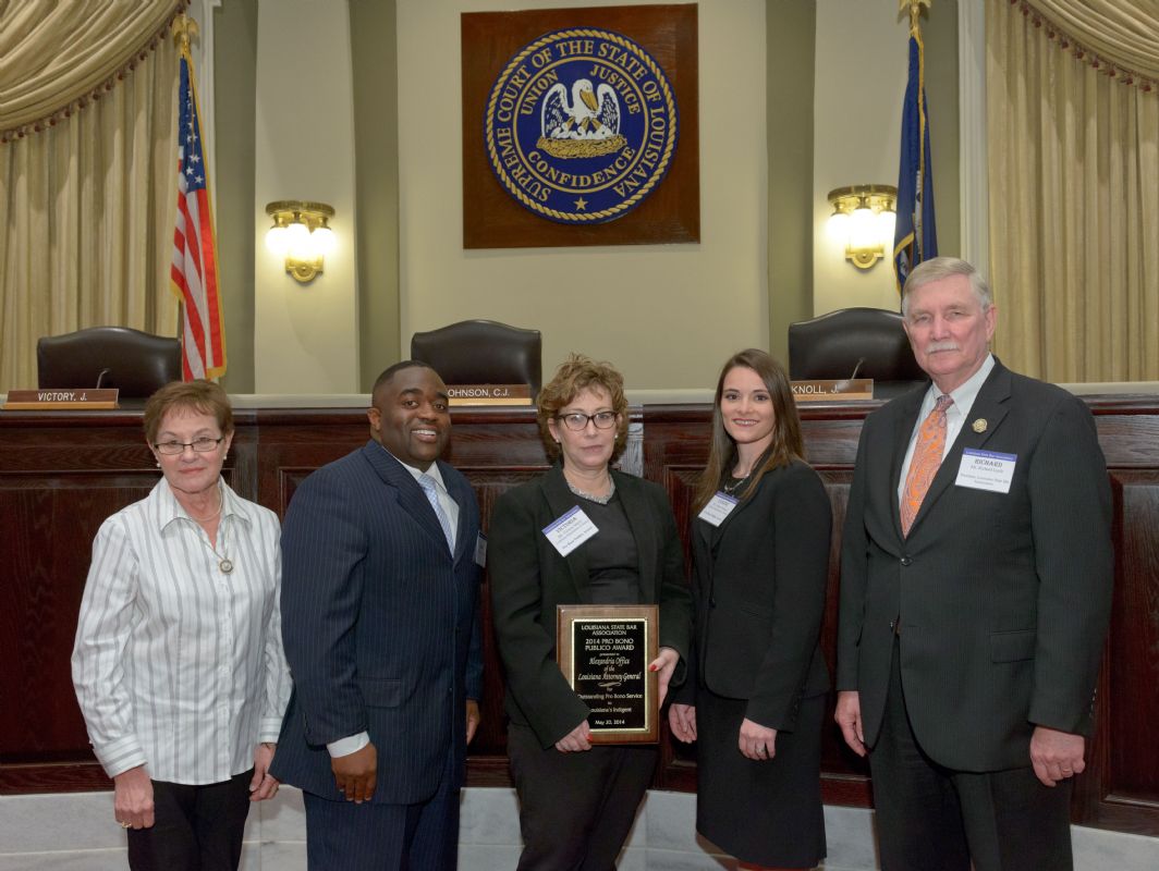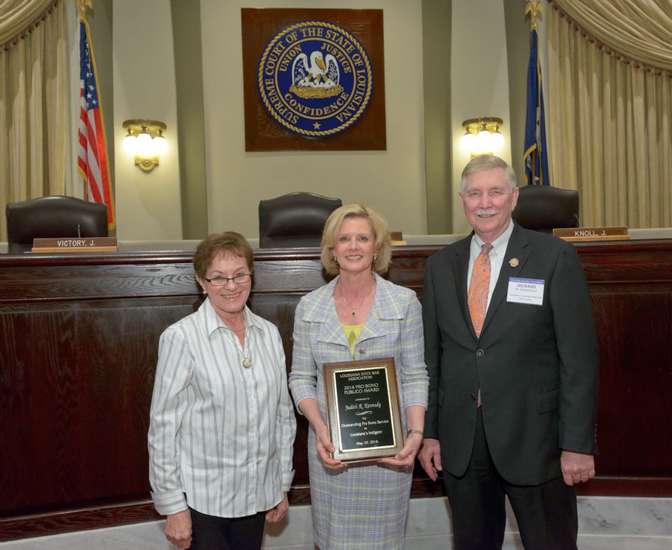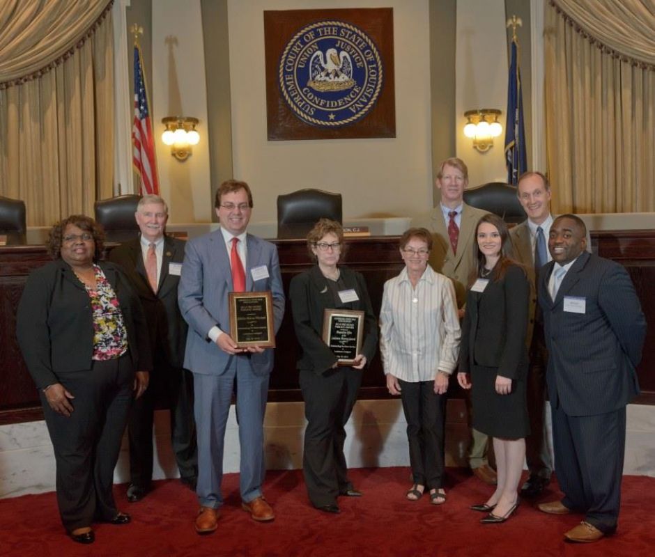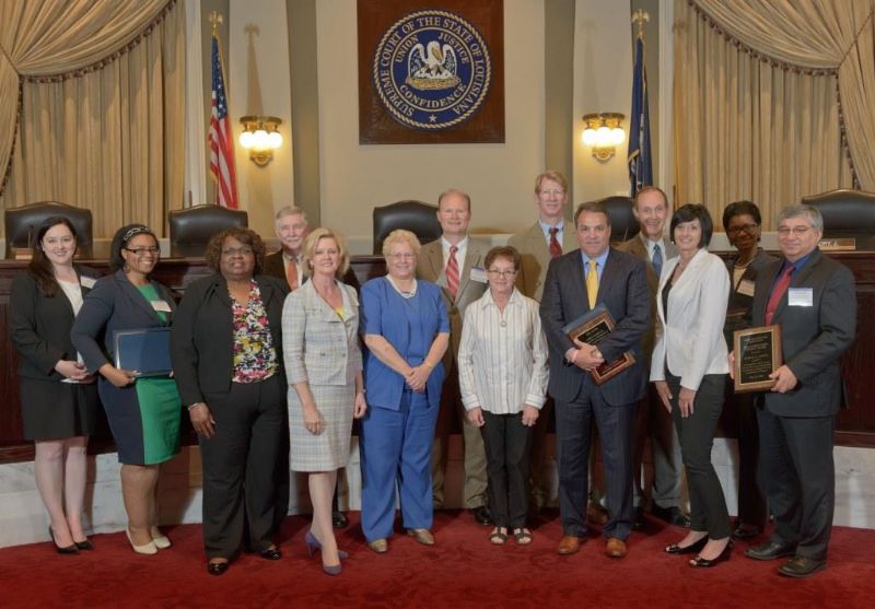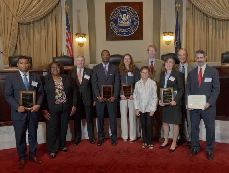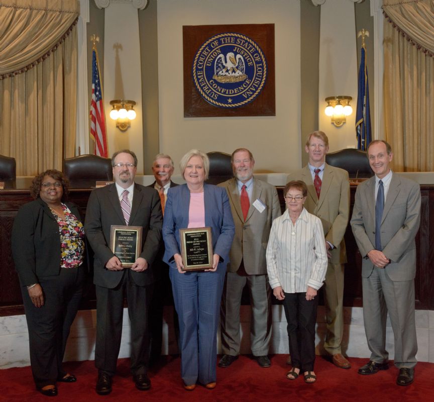 Pro Bono Publico Award recipients ( Marcus Brown, for Entergy Legal Department- New Orleans, Booker Carmichael, Phillip Antis Jr., Zebulon Winstead, Kenneth Jones, Robert Owsley, Sherrye Palmer, Michael Ferachi, Catharine Gracia, Valerie Garrett, Robert Binney, Judith Kennedy, Shane Williams and Victoria Murry and Leanne Bridges for Attorney Generals office in Alexandria, Amy Winters, Sandra Sutak) with Supreme Court Justice Jefferson D. Hughes III and LSBA President Richard K. Leefe