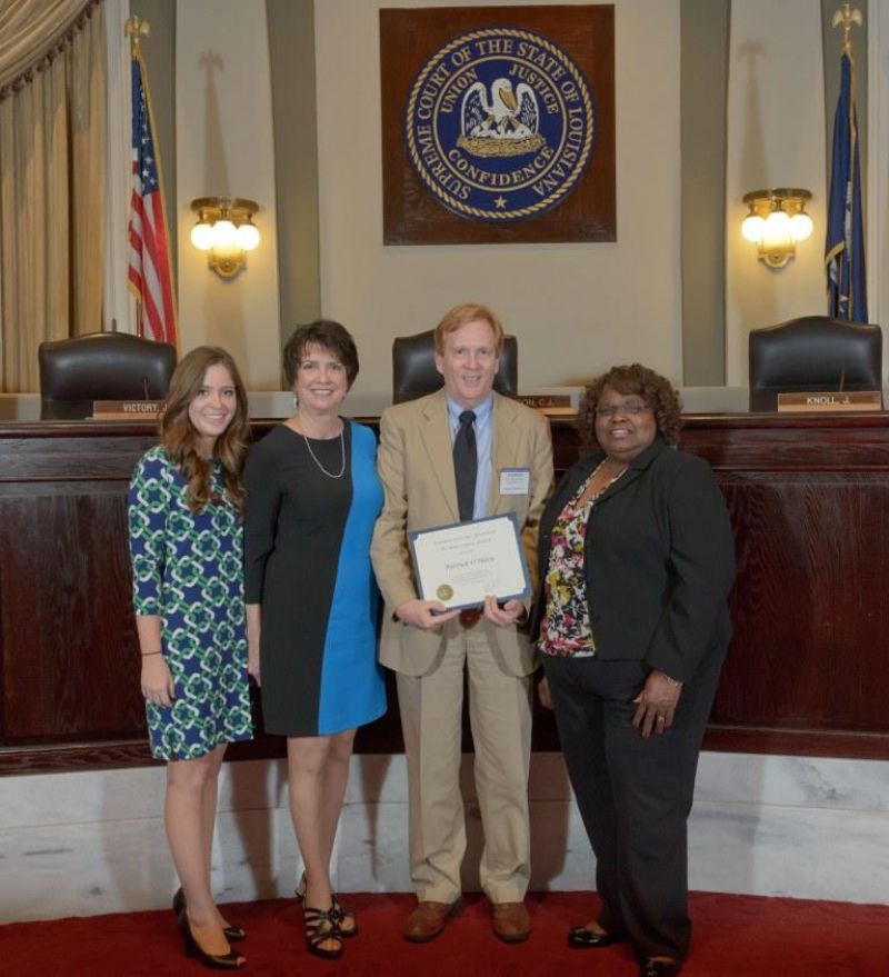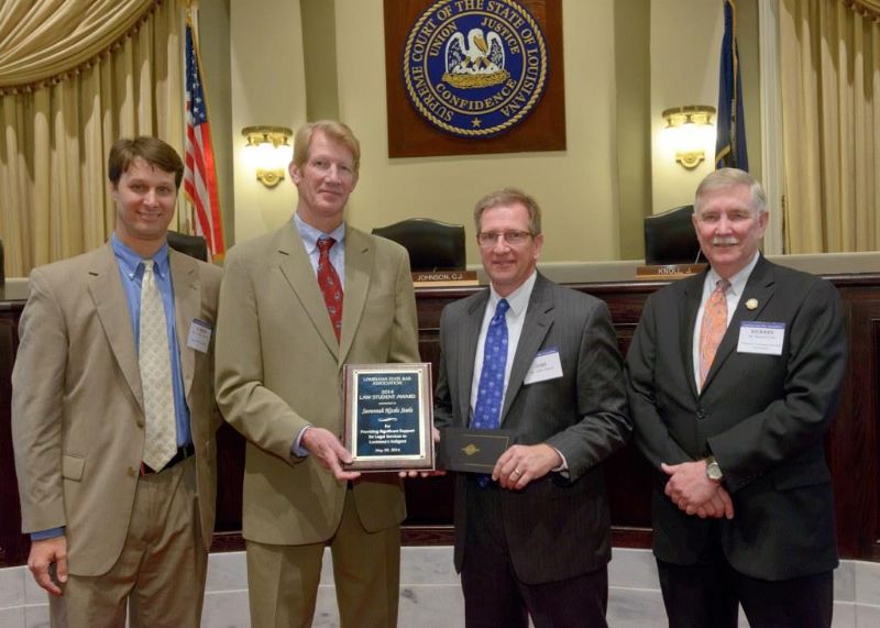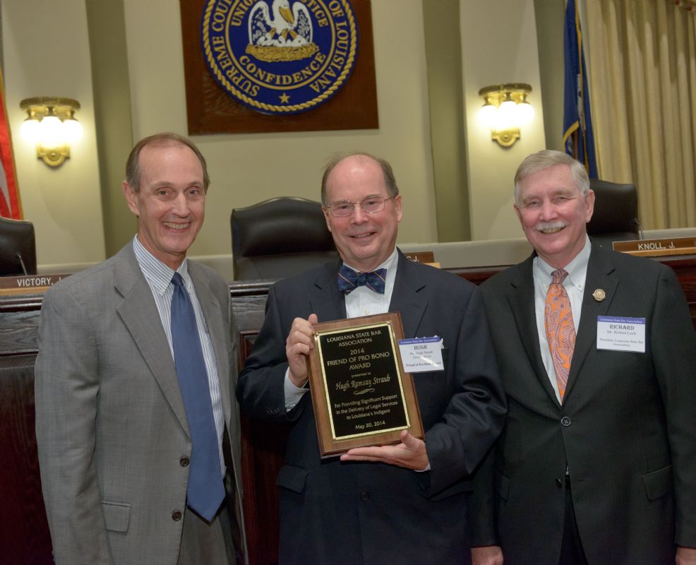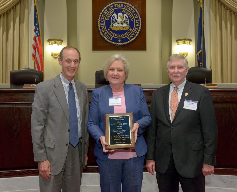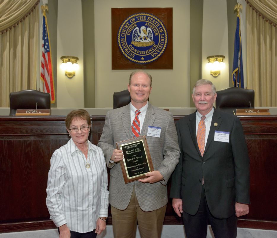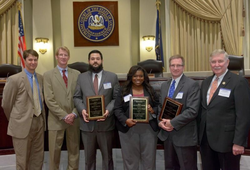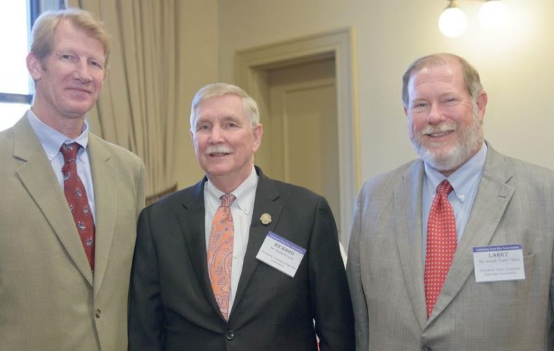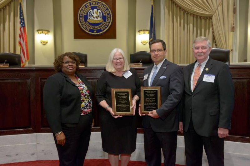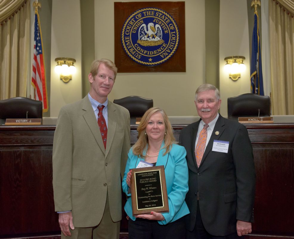 Pro Bono Publico Award recipients ( Marcus Brown, for Entergy Legal Department- New Orleans, Booker Carmichael, Phillip Antis Jr., Zebulon Winstead, Kenneth Jones, Robert Owsley, Sherrye Palmer, Michael Ferachi, Catharine Gracia, Valerie Garrett, Robert Binney, Judith Kennedy, Shane Williams and Victoria Murry and Leanne Bridges for Attorney Generals office in Alexandria, Amy Winters, Sandra Sutak) with Supreme Court Justice Jefferson D. Hughes III and LSBA President Richard K. Leefe