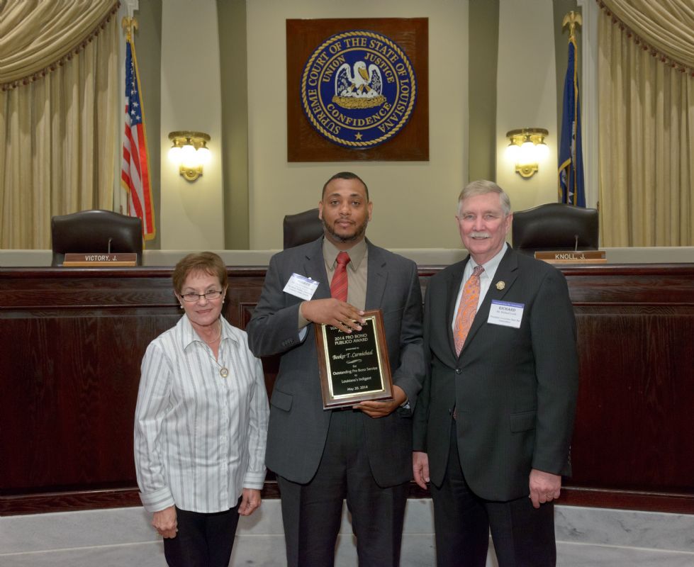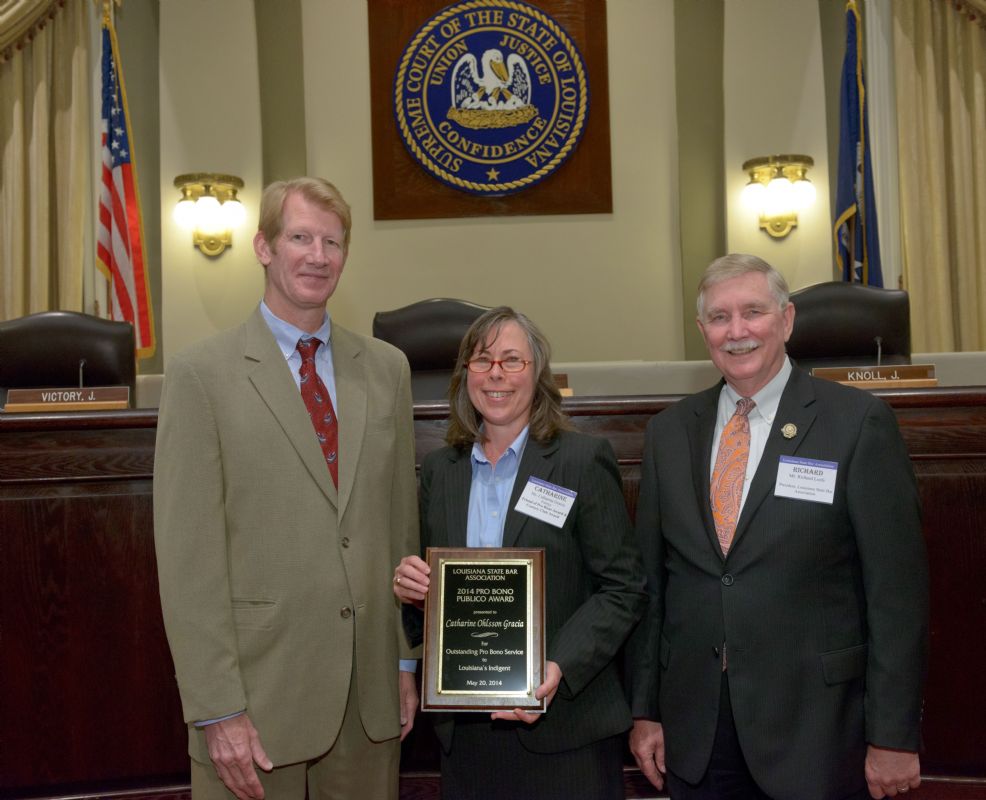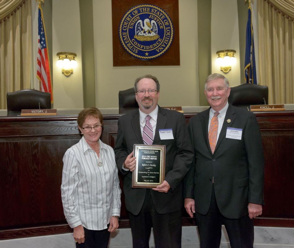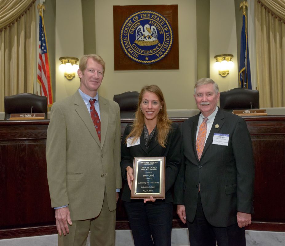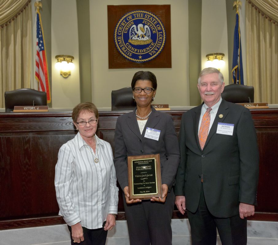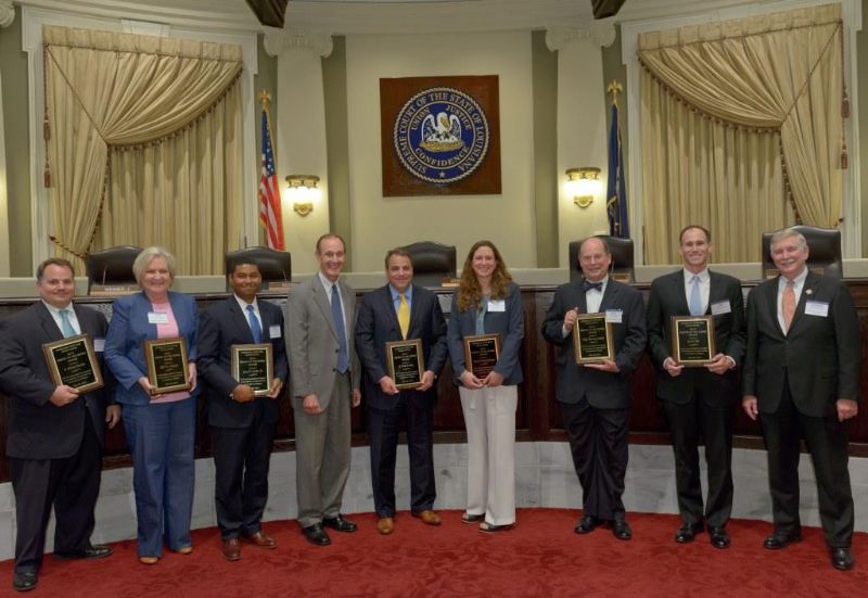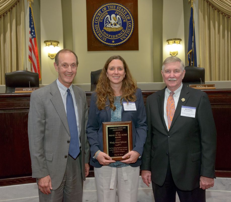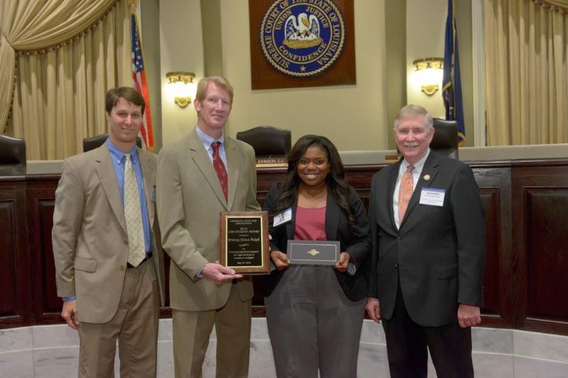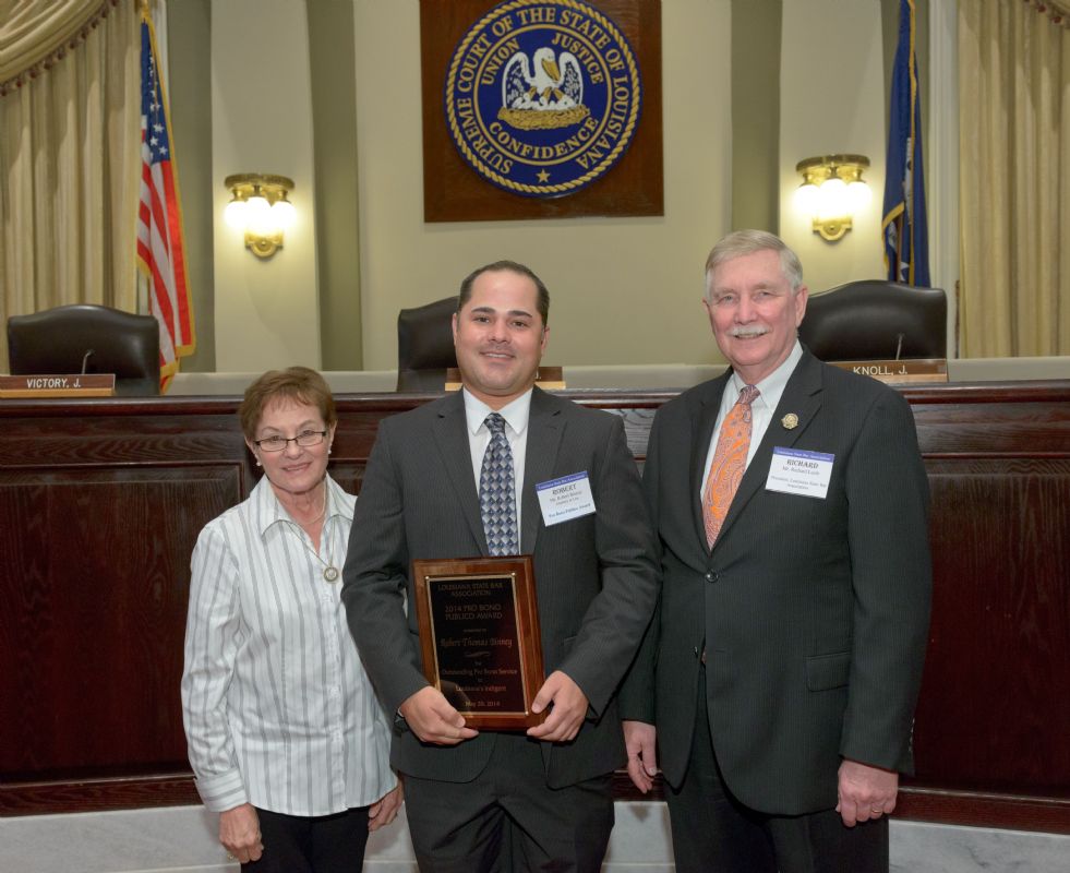 Pro Bono Publico Award recipients ( Marcus Brown, for Entergy Legal Department- New Orleans, Booker Carmichael, Phillip Antis Jr., Zebulon Winstead, Kenneth Jones, Robert Owsley, Sherrye Palmer, Michael Ferachi, Catharine Gracia, Valerie Garrett, Robert Binney, Judith Kennedy, Shane Williams and Victoria Murry and Leanne Bridges for Attorney Generals office in Alexandria, Amy Winters, Sandra Sutak) with Supreme Court Justice Jefferson D. Hughes III and LSBA President Richard K. Leefe