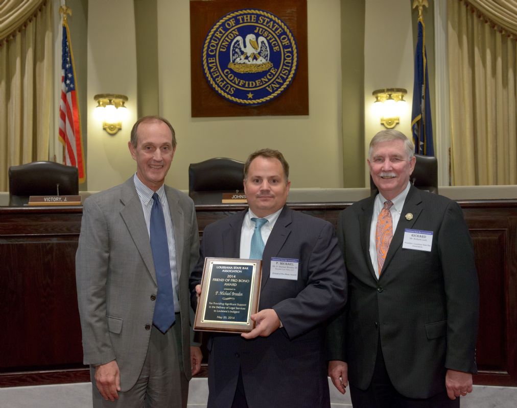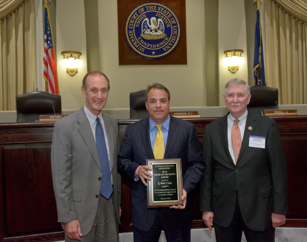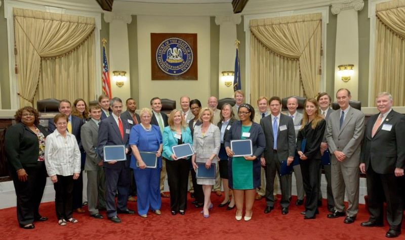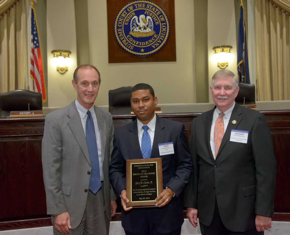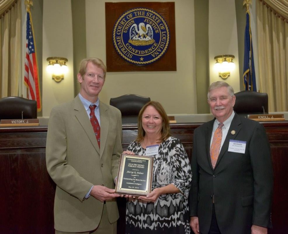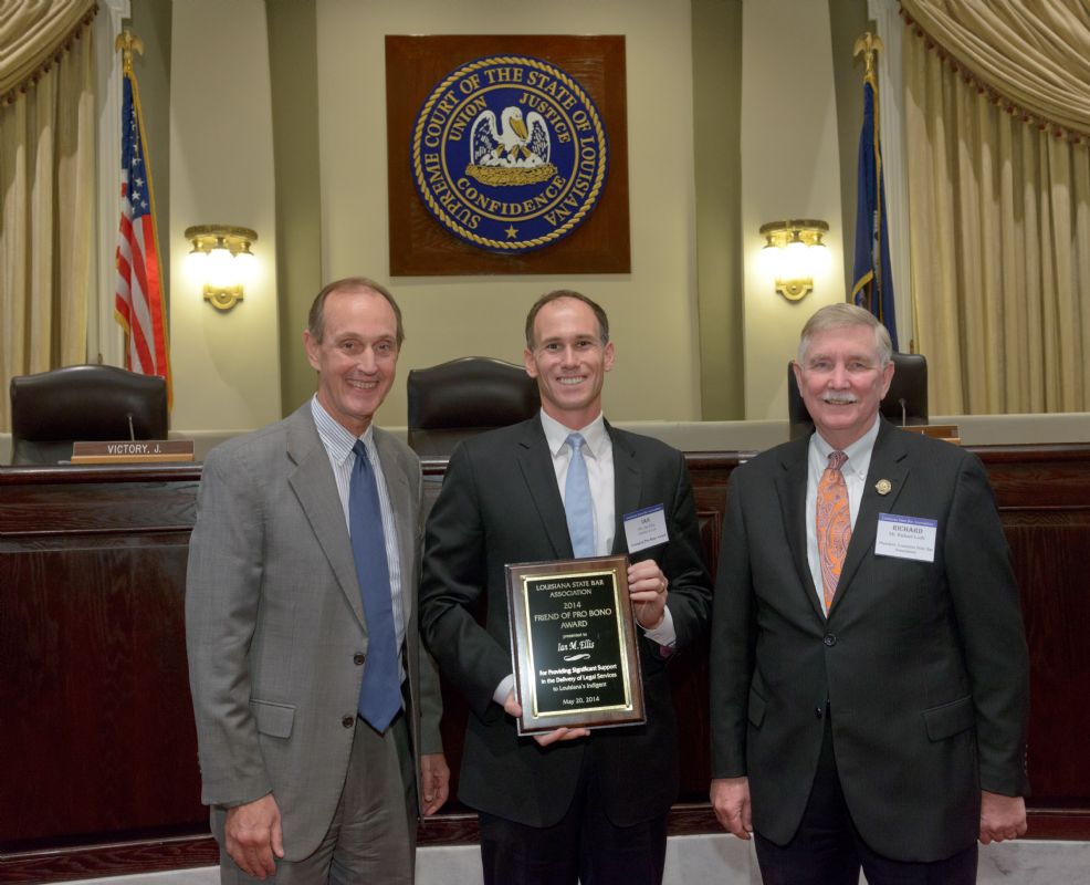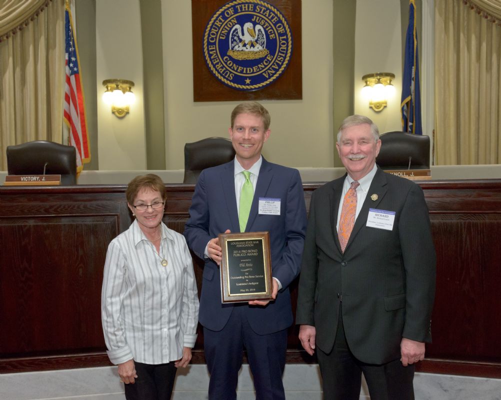 Pro Bono Publico Award recipients ( Marcus Brown, for Entergy Legal Department- New Orleans, Booker Carmichael, Phillip Antis Jr., Zebulon Winstead, Kenneth Jones, Robert Owsley, Sherrye Palmer, Michael Ferachi, Catharine Gracia, Valerie Garrett, Robert Binney, Judith Kennedy, Shane Williams and Victoria Murry and Leanne Bridges for Attorney Generals office in Alexandria, Amy Winters, Sandra Sutak) with Supreme Court Justice Jefferson D. Hughes III and LSBA President Richard K. Leefe