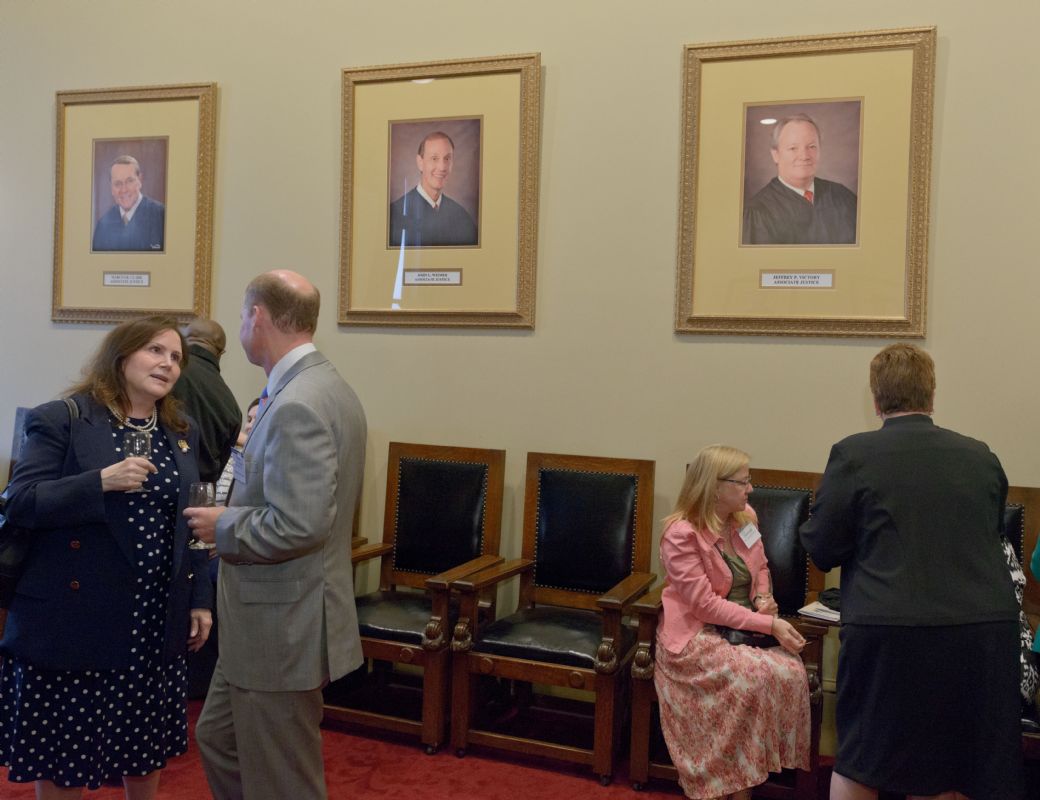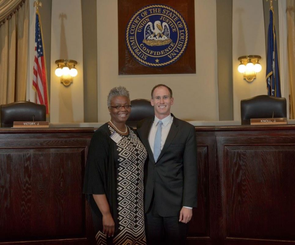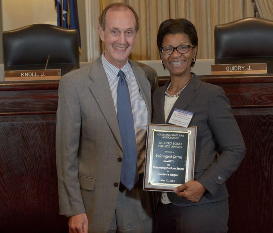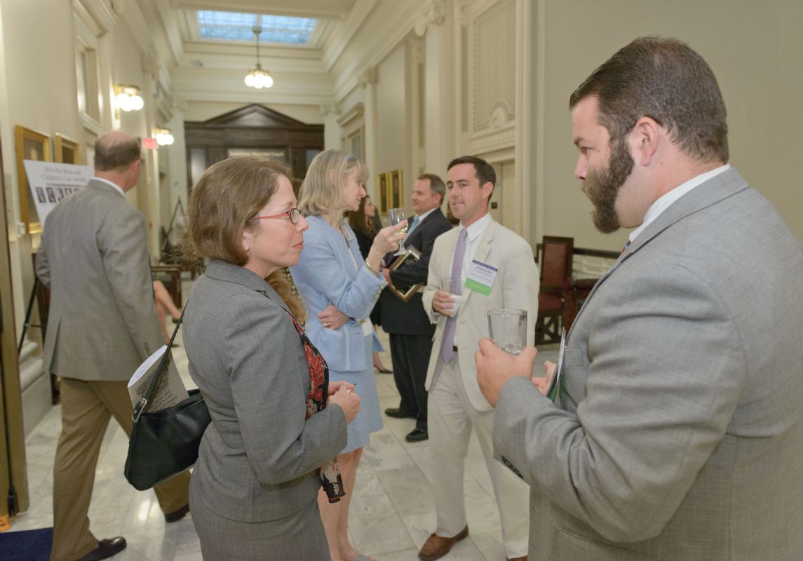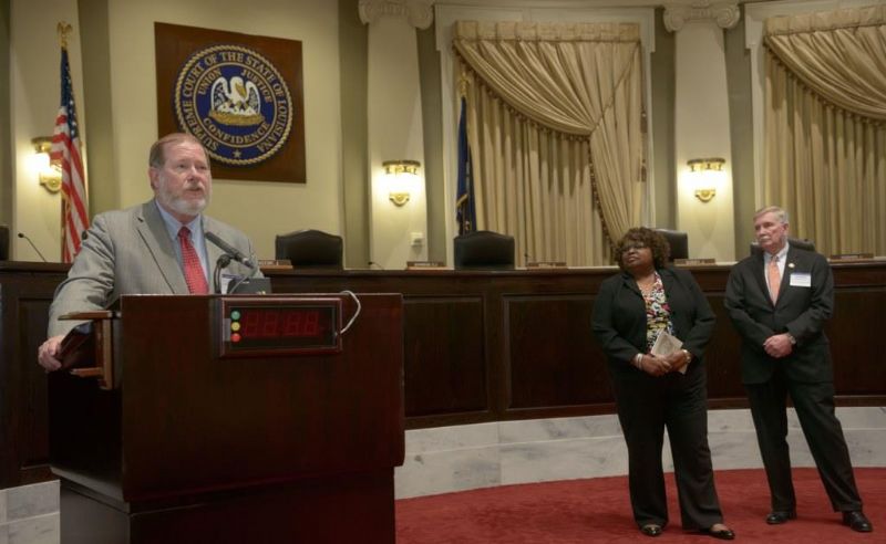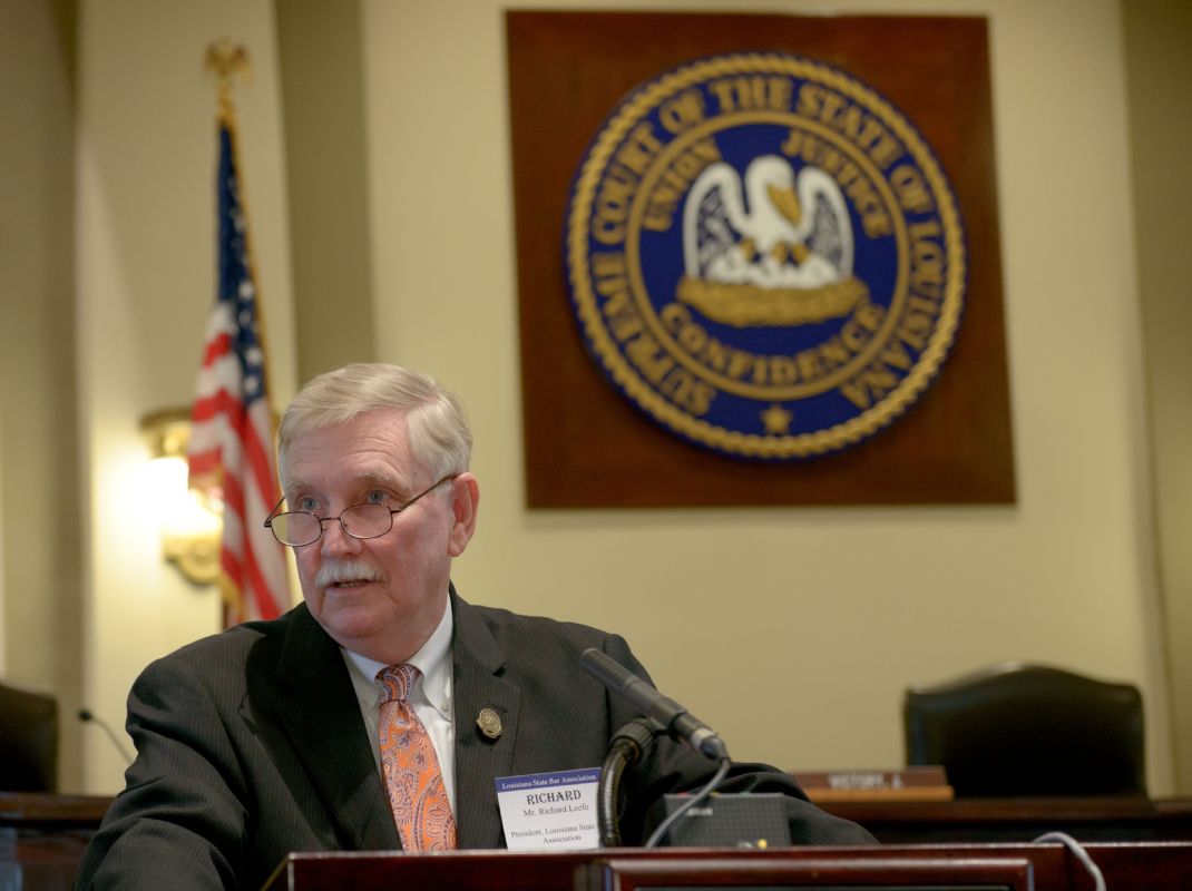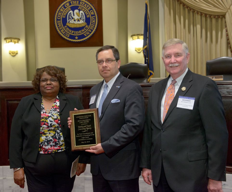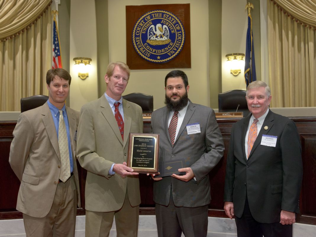 Pro Bono Publico Award recipients ( Marcus Brown, for Entergy Legal Department- New Orleans, Booker Carmichael, Phillip Antis Jr., Zebulon Winstead, Kenneth Jones, Robert Owsley, Sherrye Palmer, Michael Ferachi, Catharine Gracia, Valerie Garrett, Robert Binney, Judith Kennedy, Shane Williams and Victoria Murry and Leanne Bridges for Attorney Generals office in Alexandria, Amy Winters, Sandra Sutak) with Supreme Court Justice Jefferson D. Hughes III and LSBA President Richard K. Leefe